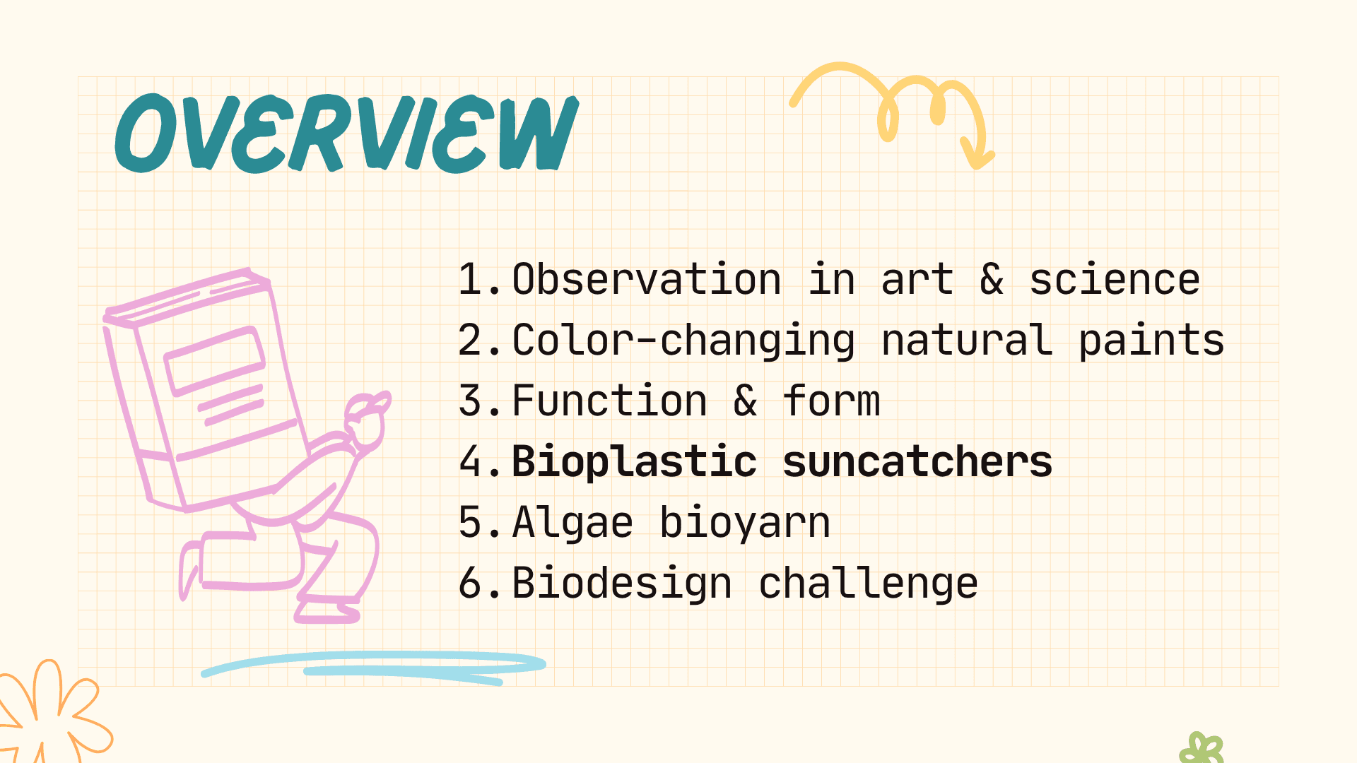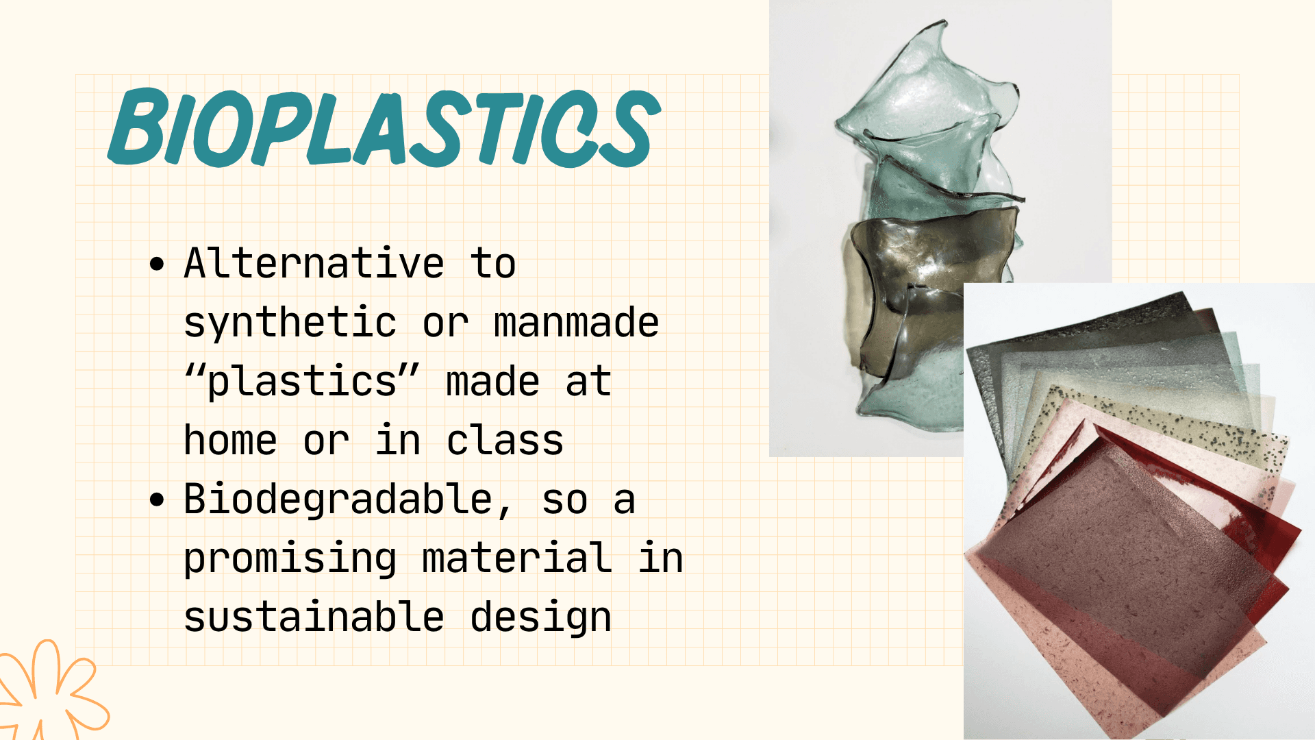 Students will explore sustainable materials by learning how material structure influences function, a key concept that connects living and designed systems. They will learn foundational concepts in polymer chemistry, biodegradability, and environmental sustainability. Students will create starch- or gelatin-based bioplastics, then dye, cure, and shape them into suncatchers. This approach will connect material design to real-world environmental and human impacts, emphasizing why designing for degradation and reuse matters.