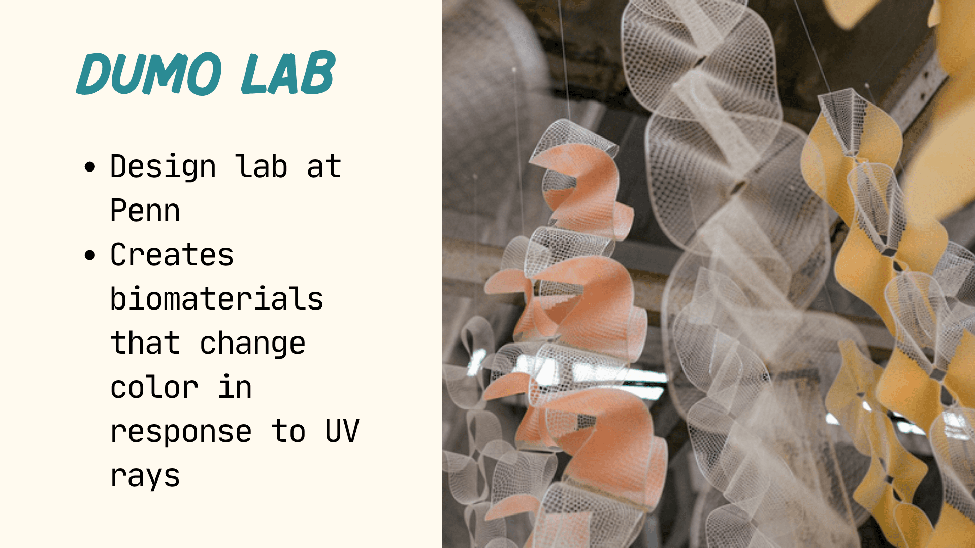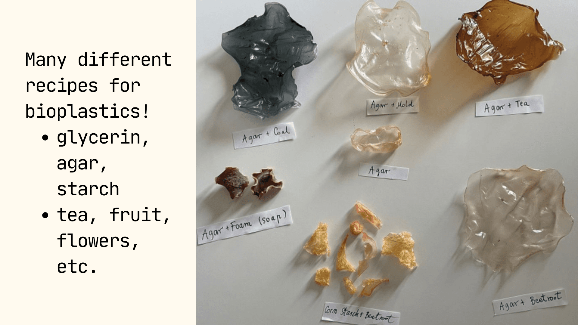 Students will explore sustainable materials by learning how material structure influences function, a key concept that connects living and designed systems. They will learn foundational concepts in polymer chemistry, biodegradability, and environmental sustainability. Students will create starch- or gelatin-based bioplastics, then dye, cure, and shape them into functional or sculptural forms such as product packaging, origami, and more. They will perform basic material tests, such as flexibility, tear strength, and water response, to evaluate how structural differences can affect use and durability. This approach will connect material design to real-world environmental and human impacts, emphasizing why designing for degradation and reuse matters.